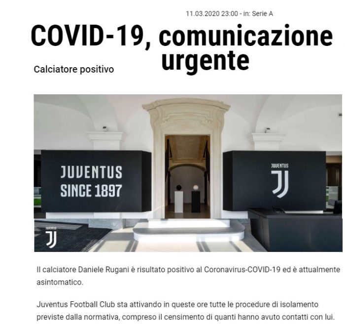 “El futbolista Daniele Rugani dio positivo del Coronavirus-COVID-19 y actualmente no presenta síntomas”, sostuvo el club en un comunicado.