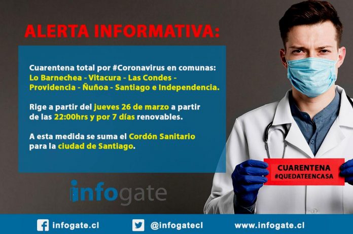 El Gobierno anunció hace pocos instantes la declaratoria de CUARENTENA TOTAL para siete comunas de la ciudad de Santiago, a contar de este jueves 26 de marzo, a contar de las 22 horas, en el marco de las medidas de emergencia adoptadas por el brote epidémico de coronavirus Covid-19.