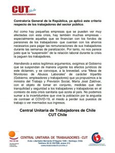 La Central Unitaria de Trabajadores (CUT) emitió un comunicado que en lo principal dice: “Rechazamos categóricamente este dictamen, y cuestionamos la legalidad del mismo en el sentido de que impone una suspensión de las obligaciones de la relación laboral por vía administrativa, lo cual es una contravención a nuestras normas legales vigentes. Esta decisión administrativa del Gobierno, deja a los trabajadores en la más absoluta desprotección respecto de sus ingresos, en uno de los momentos más complejos…”.