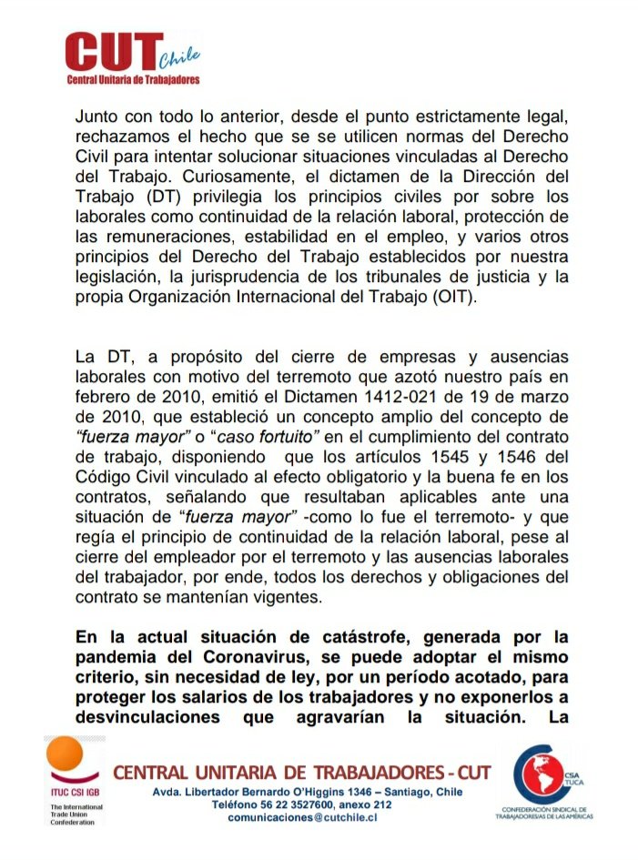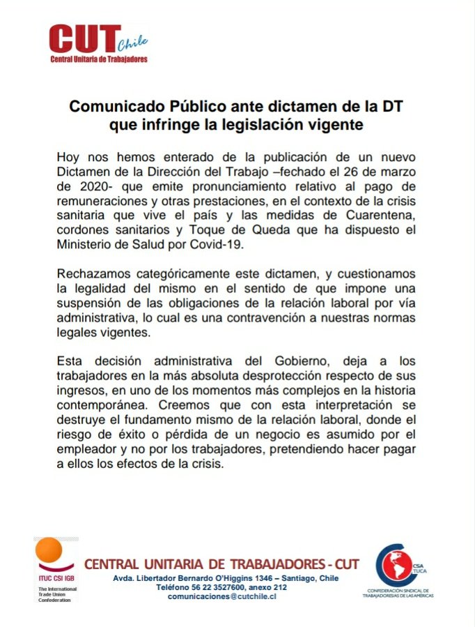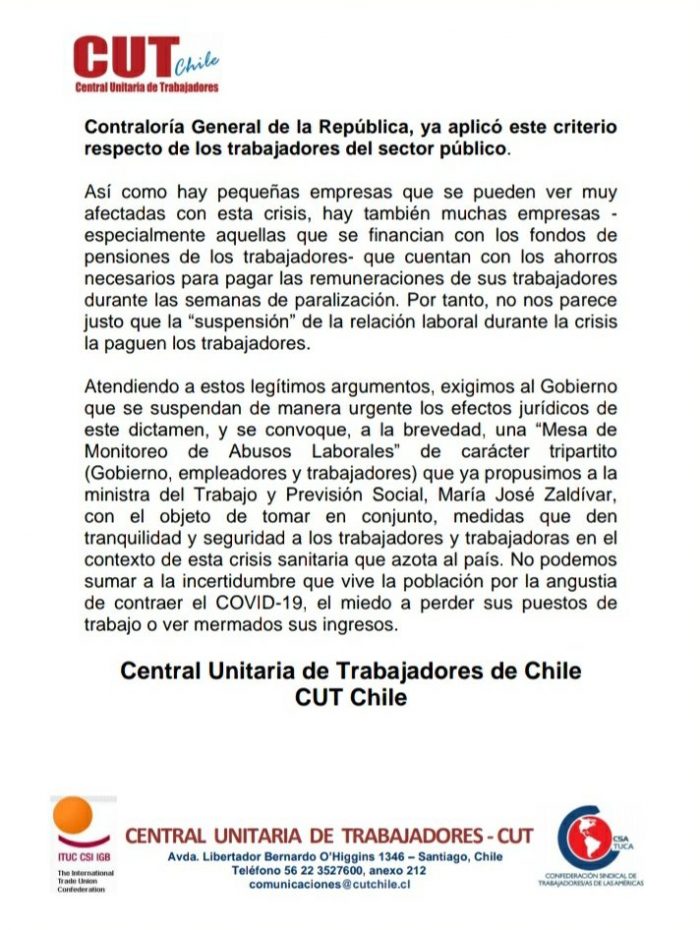 La Central Unitaria de Trabajadores (CUT) emitió un comunicado que en lo principal dice: “Rechazamos categóricamente este dictamen, y cuestionamos la legalidad del mismo en el sentido de que impone una suspensión de las obligaciones de la relación laboral por vía administrativa, lo cual es una contravención a nuestras normas legales vigentes. Esta decisión administrativa del Gobierno, deja a los trabajadores en la más absoluta desprotección respecto de sus ingresos, en uno de los momentos más complejos…”.