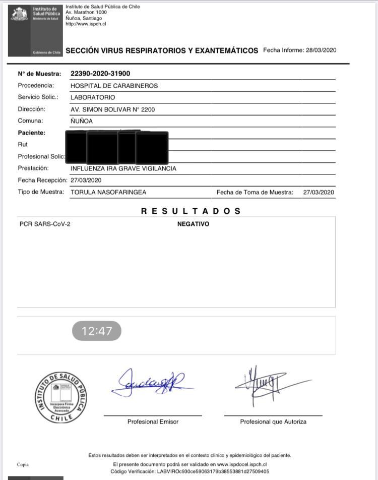 El jefe de servicios de pacientes críticos del Hospital de Carabineros, doctor Gustavo Huerta, explicó que en un principio la mujer de 64 años dio positivo al test de CORONAVIRUS rápido, pero que el diagnóstico hecho por el Instituto de Salud Pública (ISP) a través de PCR dio negativo.