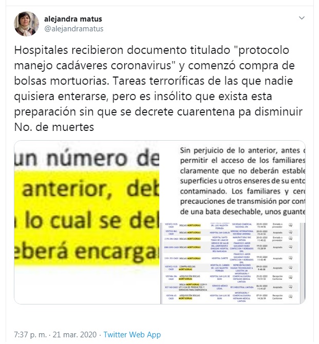 Como respuesta a este punto, la presidenta de la Federación de Asociaciones de la Salud Pública (Fedasap), Carmen Luz Scaff, precisó textualmente, comentando este tuit de Matus, que «compraron alrededor de 10.000 bolsas mortuorias y el «Protocolo para el Manejo de Cadáveres de Casos de COVID-19″ es del 10 de marzo, sin hasta ahora decretar Cuarentena Total Obligatoria para proteger la vida».