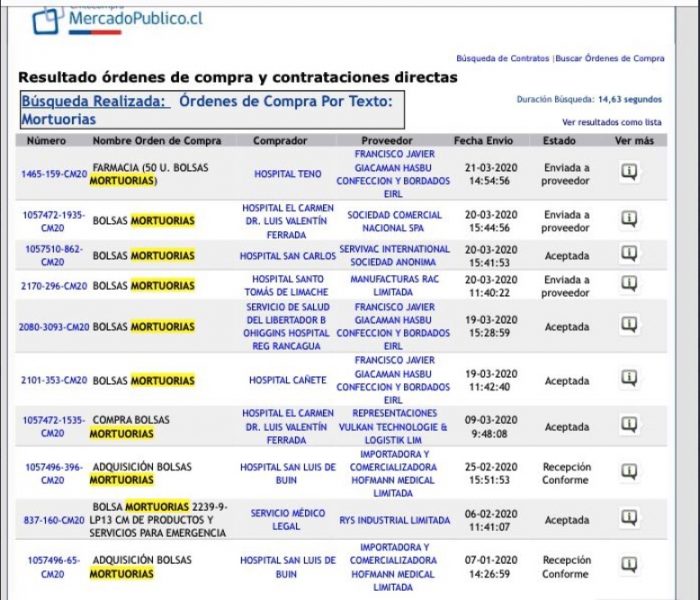 Sobre las compras, las órdenes proceden de los hospitales de Teno, San Carlos, Cañete, Talagante, Regional de Rancagua, El Carmen Dr. Luis Valentín Ferrada, Santo Tomás de Limache y la unidad de salud de la Municipalidad de Navidad. Asimismo existe una orden de compra del Hospital San Juan de Dios de Las Serena, dirigida a la mantención de la cámara mortuoria de dicho centro de salud.