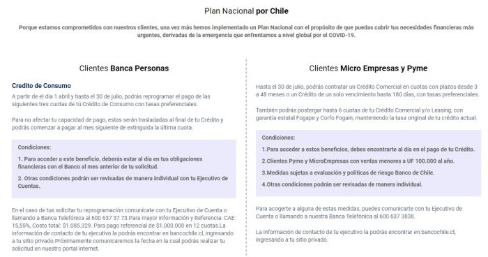 El banco –como otros- a través de su página web informo del llamado “Plan Nacional por Chile: Porque estamos comprometidos con nuestros clientes, una vez más hemos implementado un Plan Nacional con el propósito de que puedas cubrir tus necesidades financieras más urgentes, derivadas de la emergencia que enfrentamos a nivel global por el COVID-19”, detallo lo siguiente: