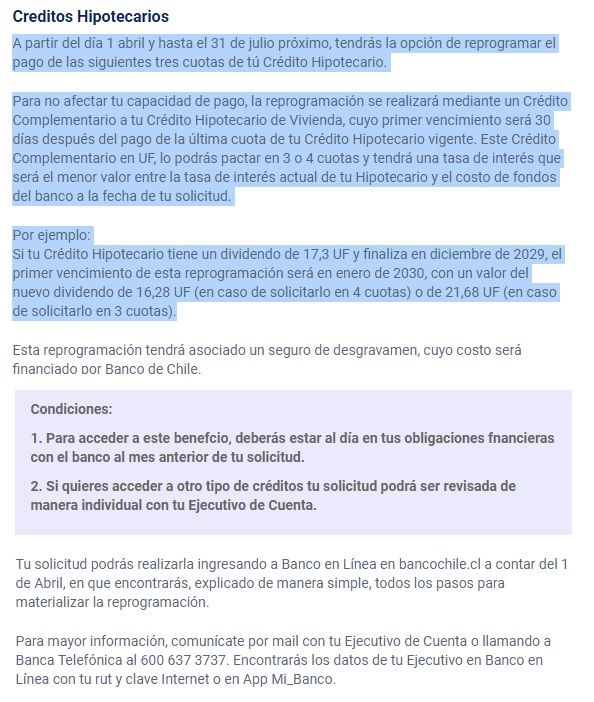 “Créditos Hipotecarios: A partir del día 1 abril y hasta el 31 de julio próximo, tendrás la opción de reprogramar el pago de las siguientes tres cuotas de tú Crédito Hipotecario.Para no afectar tu capacidad de pago, la reprogramación se realizará mediante un Crédito Complementario a tu Crédito Hipotecario de Vivienda, cuyo primer vencimiento será 30 días después del pago de la última cuota de tu Crédito Hipotecario vigente. Este Crédito Complementario en UF, lo podrás pactar en 3 o 4 cuotas y tendrá una tasa de interés que será el menor valor entre la tasa de interés actual de tu Hipotecario y el costo de fondos del banco a la fecha de tu solicitud.