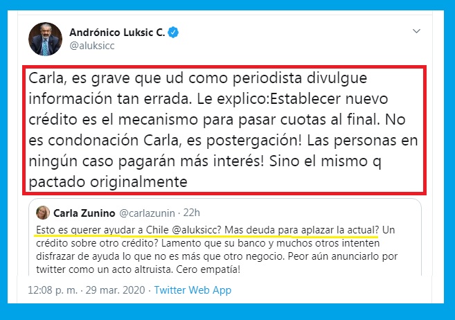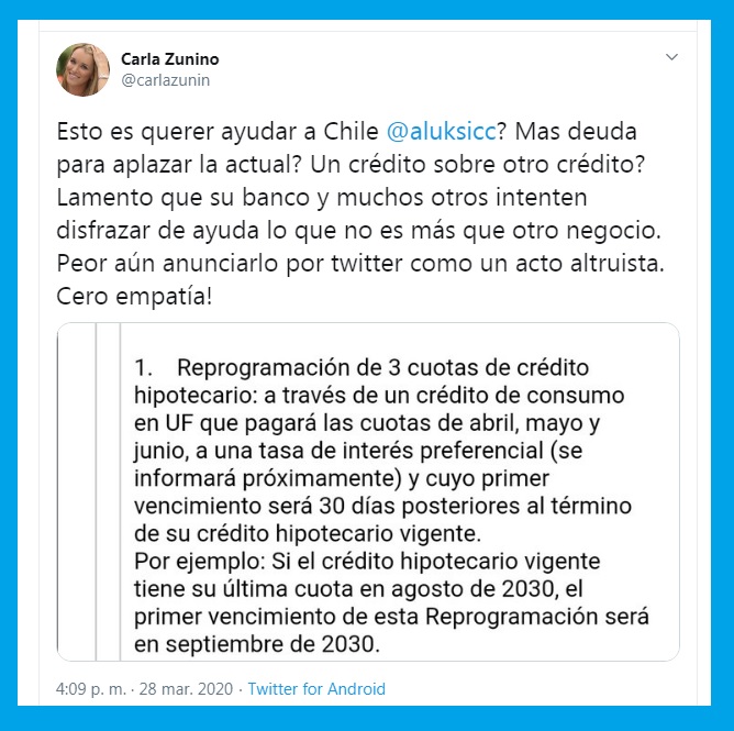 La periodista de TVN, Carla Zunino, haciéndose eco del reclamo de cientos y quizás miles de clientes del Banco de Chile, por las medida de “ayuda” anunciadas por el dueño del Banco, Andrónico Lusic (anunciado por él el 18 de marzo), la profesional –vía Twitter- lo interpeló interpeló: “Esto es querer ayudar a Chile @aluksicc? Mas deuda para aplazar la actual? Un crédito sobre otro crédito? Lamento que su banco y muchos otros intenten disfrazar de ayuda lo que no es más que otro negocio. Peor aún anunciarlo por twitter como un acto altruista. Cero empatía!”