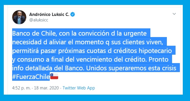 Todo comenzó cuando a través de sus redes sociales, el vicepresidente del directorio de Banco de Chile, Andrónico Luksic Craig, anunció que dicha institución financiera postergará las cuotas en algunos de sus créditos, de echo el 18 de marzo –cuando se instalaba la gravedad de la crisis por el Coronavirus- el propio dueño del banco anunció: “Banco de Chile, con la convicción d la urgente necesidad d aliviar el momento q sus clientes viven, permitirá pasar próximas cuotas d créditos hipotecario y consumo a final del vencimiento del crédito. Pronto info detallada del Banco. Unidos superaremos esta crisis #FuerzaChile”.