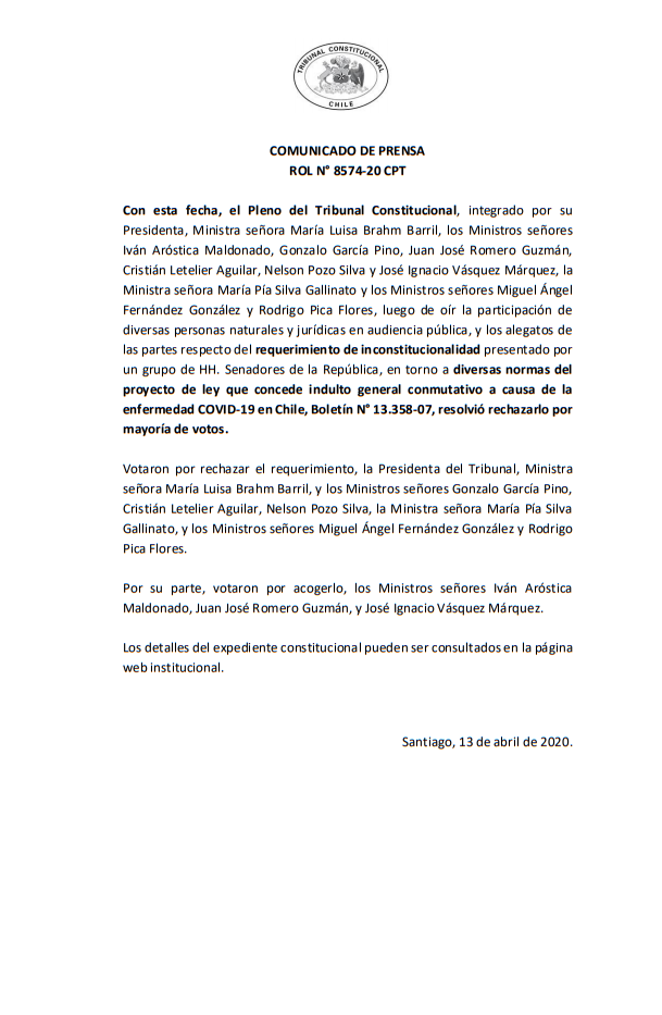 Por su parte, uno de los patrocinadores del recurso rechazado, el senador RN Francisco Chahuán, afirmó que «si bien el Tribunal Constitucional ha resuelto la constitucionalidad de la norma, nosotros estamos convencidos que hay que buscar mecanismos para proteger la vida de la población penal más vulnerable, particularmente aquellos mayores de 75 años y, en ese contexto, apelamos a que otras vías jurisdiccionales se puedan abrir para este efecto».