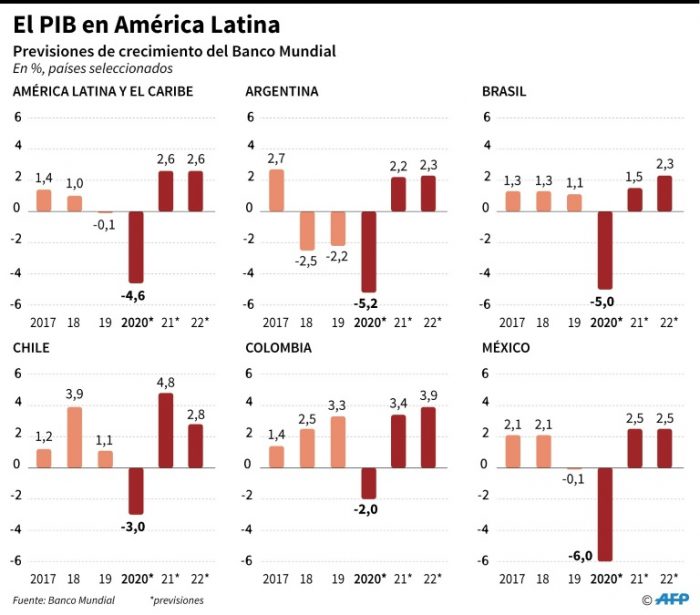 «Para 2021 se espera un retorno del crecimiento de 2,6%», dijo el Banco Mundial en un comunicado difundido este domingo, en el que advirtió que este año habrá una recesión en las principales economías de la región con una contracción de 5% en Brasil, 5,2% en Argentina y de 6% en México.