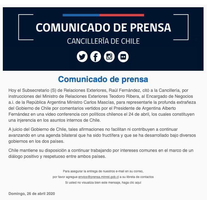 Así queda de manifiesto con la respuesta entregada por Chile al gobierno de Buenos Aires, debido a que el canciller chileno Teodoro Ribera citó al encargado de negocios de Argentina en Chile, Carlos Mascía, para “presentarle la profunda extrañeza” ante las palabras de Fernández hechas el pasado 24 de abril las que fueron calificadas como “una injerencia en los asuntos internos”.