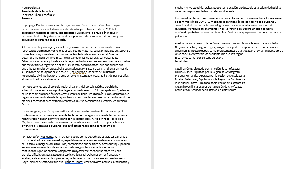 Para los parlamentarios las razones de las alarmantes cifras de Covid-19 en la zona se deben principalmente al arribo y salida de trabajadores, especialmente provenientes de las faenas mineras, por eso la solicitud de éstos es en calidad de “urgente”.