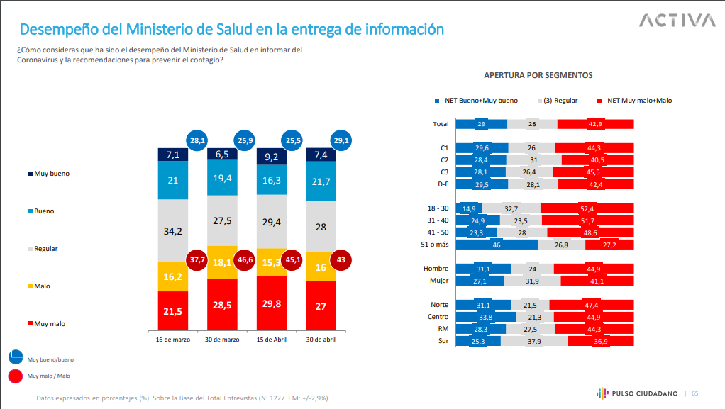 En cuanto al desempeño que ha tenido el Ministerio de Salud en la entrega de información para evitar el contagio del CORONAVIRUS, un 43% señala que ha sido malo y muy malo, mientras que un 29,1% dice que ha sido bueno y muy bueno.