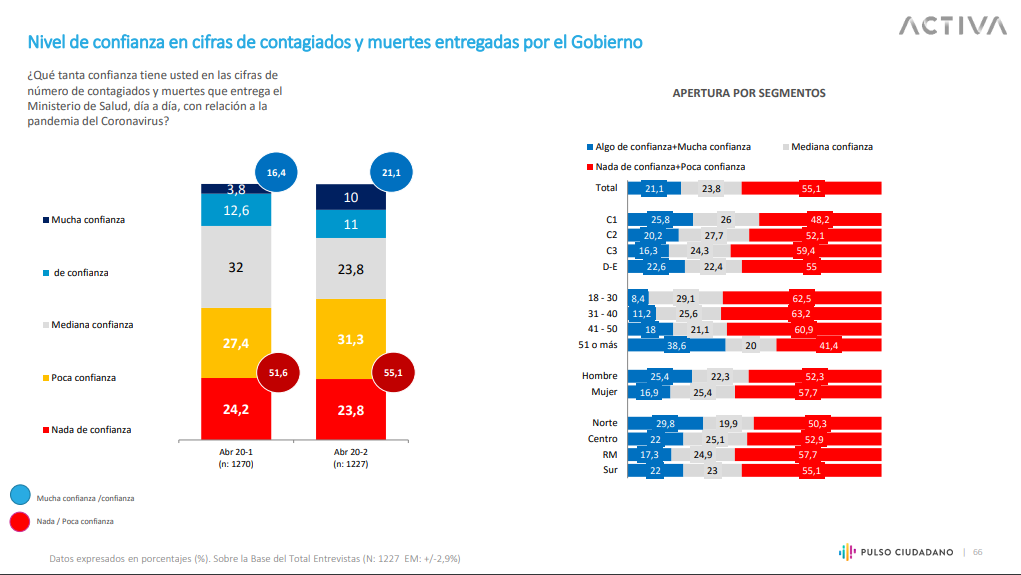 Finalmente, el estudio da cuenta de un alto nivel de desconfianza en las cifras de contagiados y muertes por COVID-19 que entrega el Gobierno, ya que un 55,1% apunta a que no tiene nada de confianza o muy poca en relación al 21,1% que sostiene tener confianza y mucha confianza.