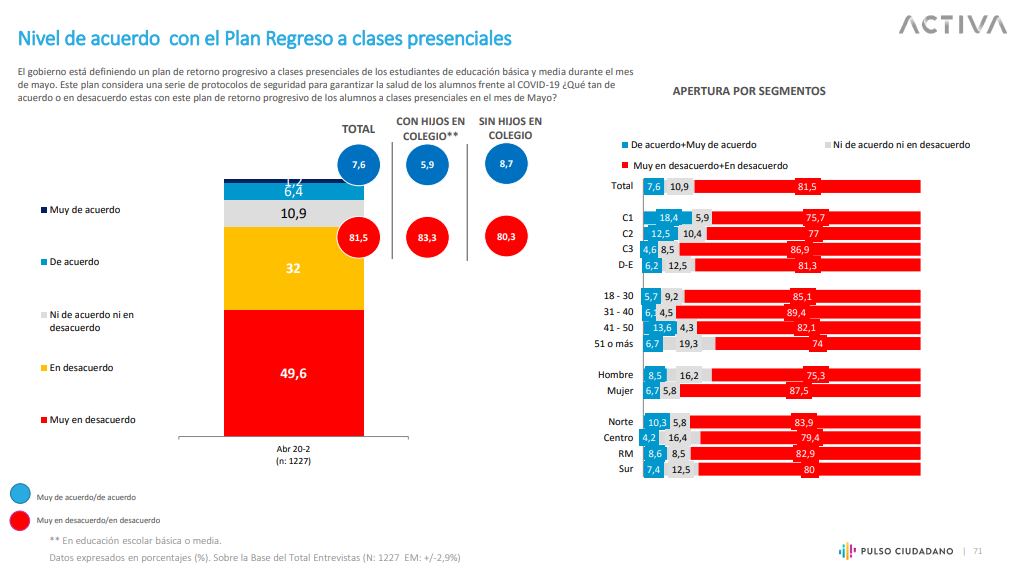 Asimismo, cuando se le hace la pregunta sobre el nivel de acuerdo con que los estudiantes regresen a clases presenciales en mayo próximo, un amplio 81,5% de los encuestados rechaza el hecho que los escolares retornen a las aulas y un 7,6% asiente con que las clases presenciales deben realizarse.