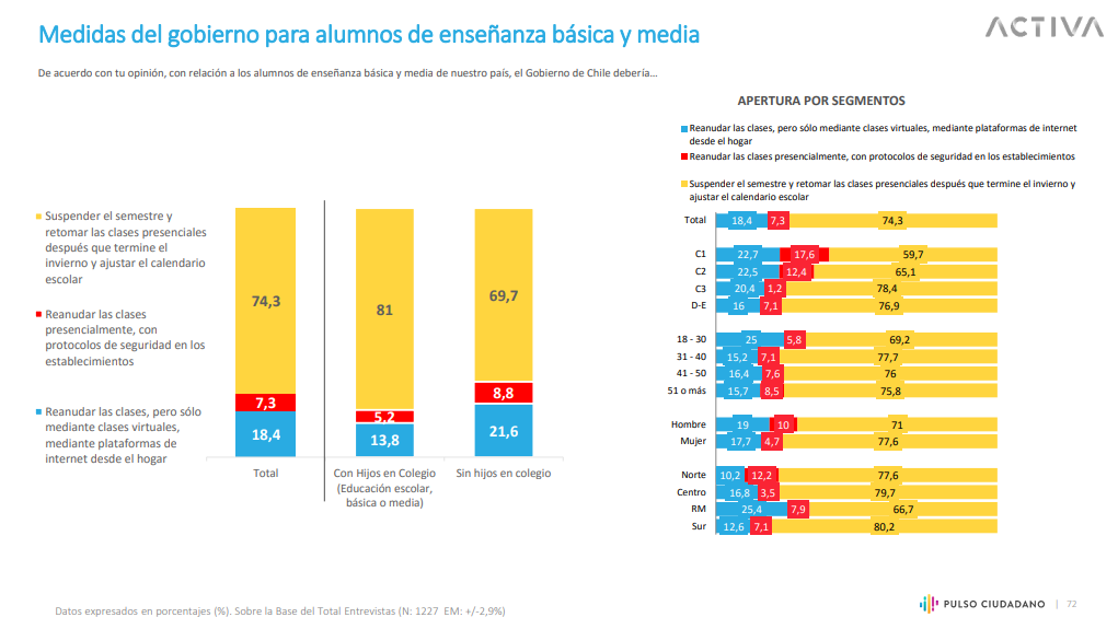Además, el sondeo también pregunta respecto a las medidas que el Gobierno debiera aplicar a los alumnos de enseñanza básica y media, la respuesta fue contundente con un 74,3% a favor que se suspenda el semestre y se retomen las clases presenciales después de terminar el invierno y ajustando el calendario escolar y solamente un 18,4% a favor de la idea del Ejecutivo.