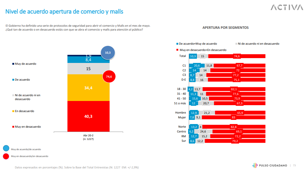 Asimismo, un 74,6% de los entrevistados por Pulso Ciudadano se muestra en desacuerdo y muy en desacuerdo con la apertura del comercio y malls, mientras que un 10,3% dice estar a favor de que la actividad comercial se reanude en medio de la crisis sanitaria.