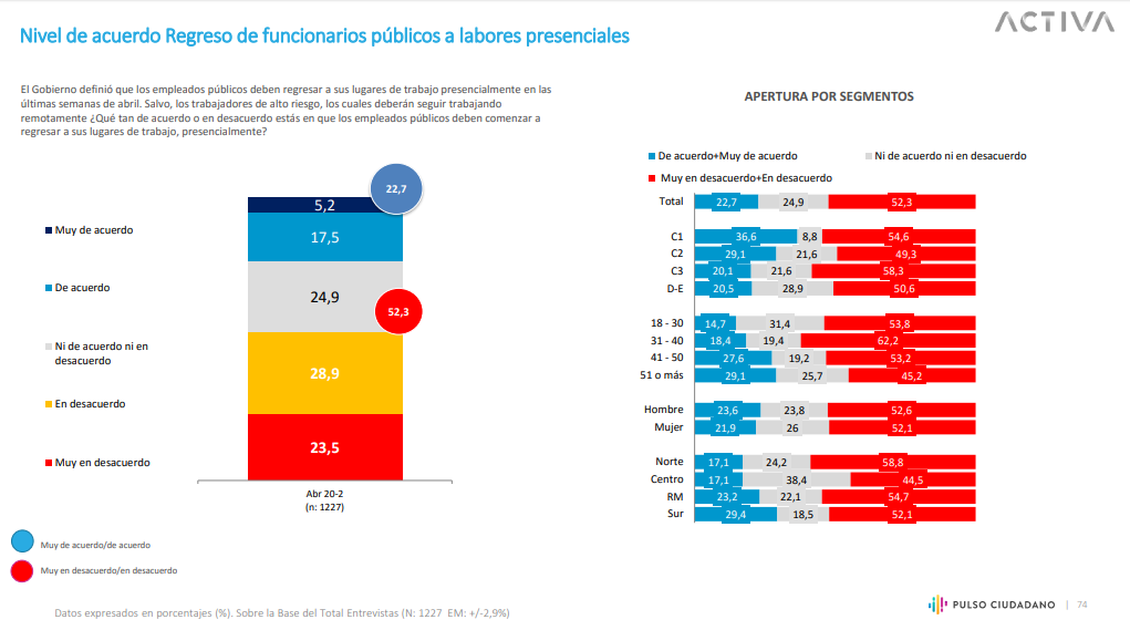 También un alto porcentaje, un 52,3% se muestra contrario a que los funcionarios públicos regresen a sus actividades presenciales y un 22,7% dice estar a favor de lo planteado por el Gobierno.