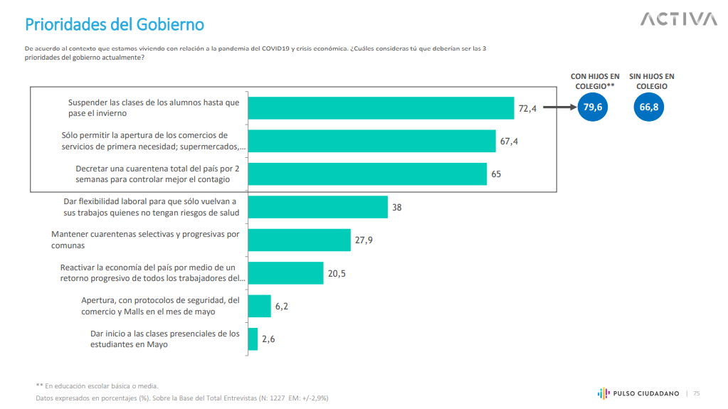 En cuanto a las tres prioridades que debería tener el Gobierno en relación a enfrentar la pandemia del COVID-19, un 72,4% dice que hay que suspender las clases de los alumnos hasta que pase el invierno, cifra que aumenta a 79,6% cuando se le pregunta a padres que tienen hijos en el colegio y un 66,8% cuando no tienen hijos.