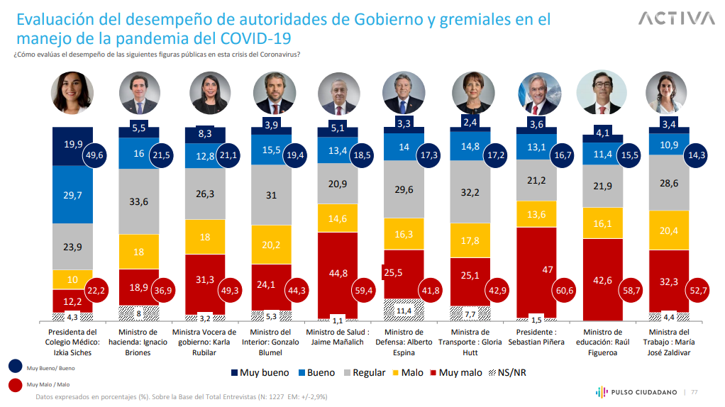 Sobre la evaluación que la ciudadanía hace del desempeño de autoridades del Gobierno y gremiales en el manejo de la pandemia, un 49,6% respalda a la presidenta del Colegio Médico, Izkia Siches, siendo seguida por el titular de Hacienda, Ignacio Briones, con un 21,5% y la vocera Karla Rubilar con un 21,1%.