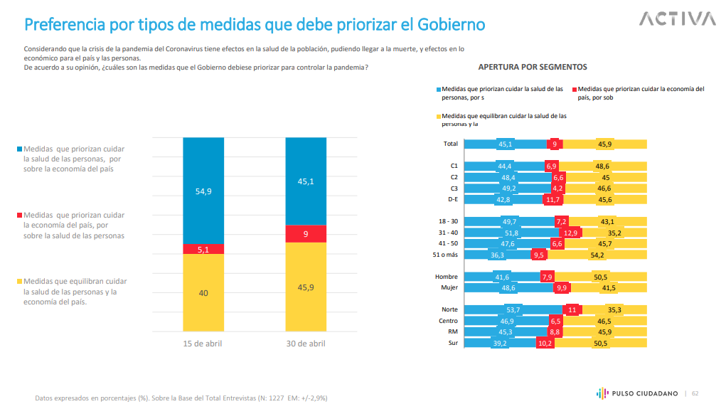 Otro aspecto que toma en cuenta la encuesta Pulso Ciudadano es la preferencia por tipos de medidas que debe priorizar el Gobierno, en donde se menciona que un 45,1% cree que el Ejecutivo debe apuntar a la salud de las personas por sobre la economía del país y un 45,9 que se debe adoptar medidas que equilibren cuidar la salud de las personas y la economía del país.
