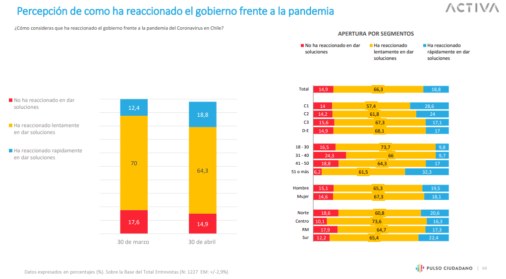 Sobre la rapidez con la que el Gobierno ha reaccionado para dar soluciones frente a la pandemia del COVID-19, un 64,3% sostiene que lo ha hecho lentamente y un 18,8% en que ha reaccionado rápidamente en entregar soluciones a la población.