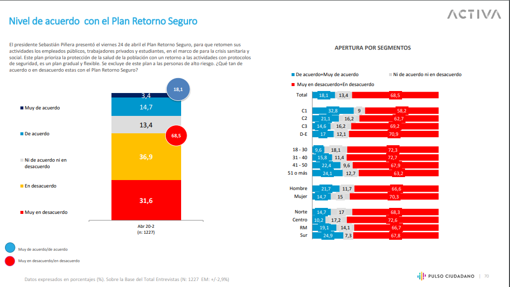 La idea impuesta por el Gobierno de imponer una “nueva normalidad” en el país en medio de la pandemia del CORONAVIRUS provocó un rechazo mayoritario a la propuesta del Presidente Sebastián Piñera con su Plan Retorno Seguro, ya que la encuesta Pulso Ciudadano muestra que un 68,5% está en desacuerdo y muy en desacuerdo de volver a las actividades laborales y estudiantiles.