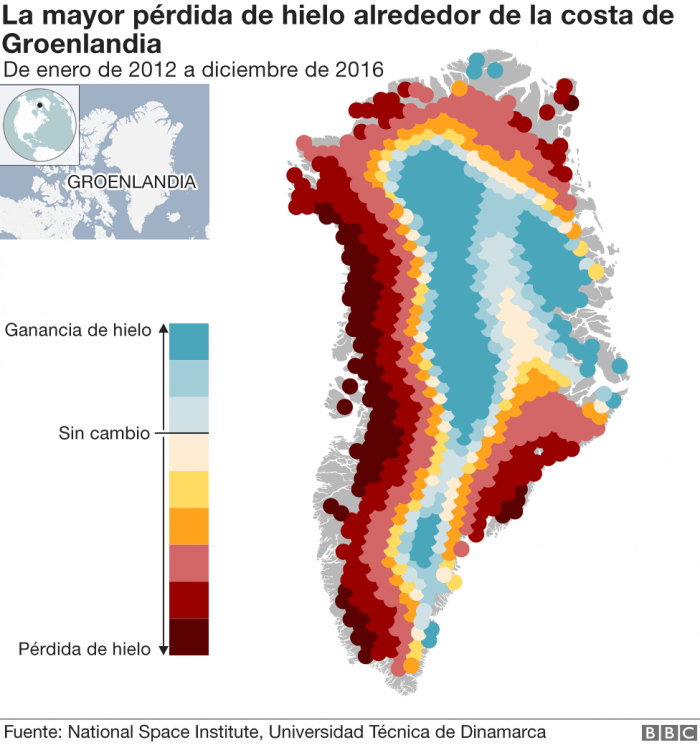 Groenlandia contribuyó con el 20-25% del aumento del nivel del mar en las últimas décadas, según Tedesco. Si las emisiones de carbono siguen subiendo, esta cuota podría subir hasta en torno el 40% para 2100, indicó, aunque hay una incertidumbre considerable sobre cómo se desarrollará el derretimiento del hielo en la Antártida, la mayor capa helada de la Tierra.