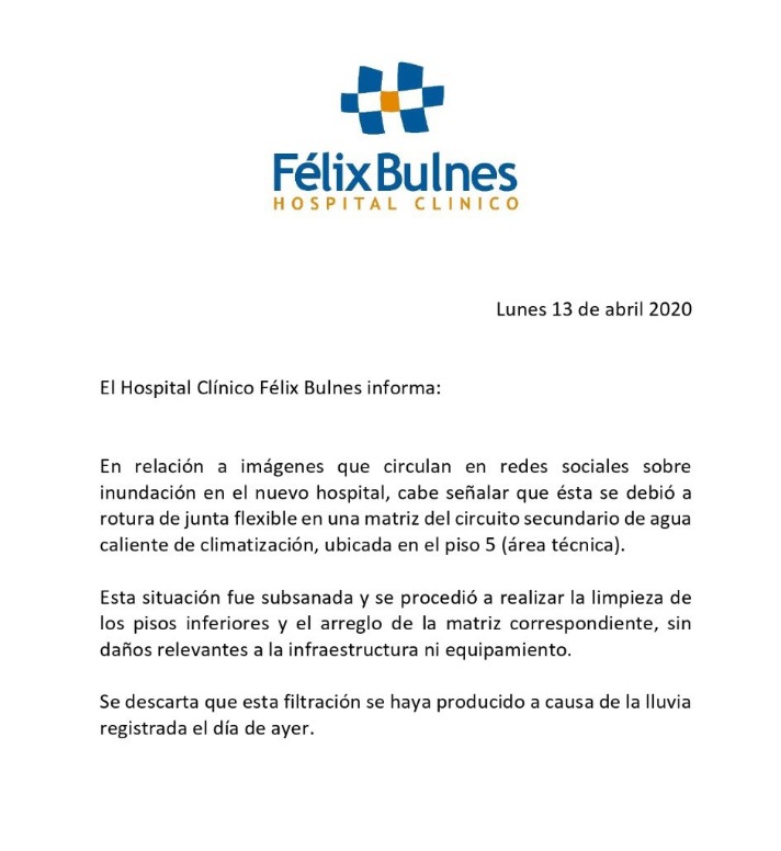 A través de un comunicado, el Hospital Félix Bulnes descartó las informaciones circuladas desde ayer y que atribuían la inundación que afectó a sectores de la nueva infraestructura, puesta en marcha este domingo por el Presidente Sebastián Piñera, a la lluvia que cayó sobre Santiago.