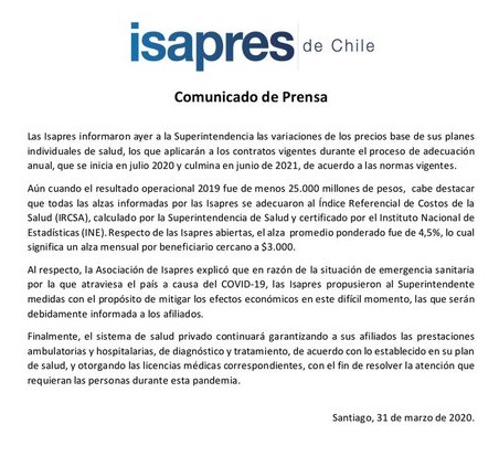 Anuncio del alza de planes por parte de la Asociación de Isapres difundido ayer lunes: