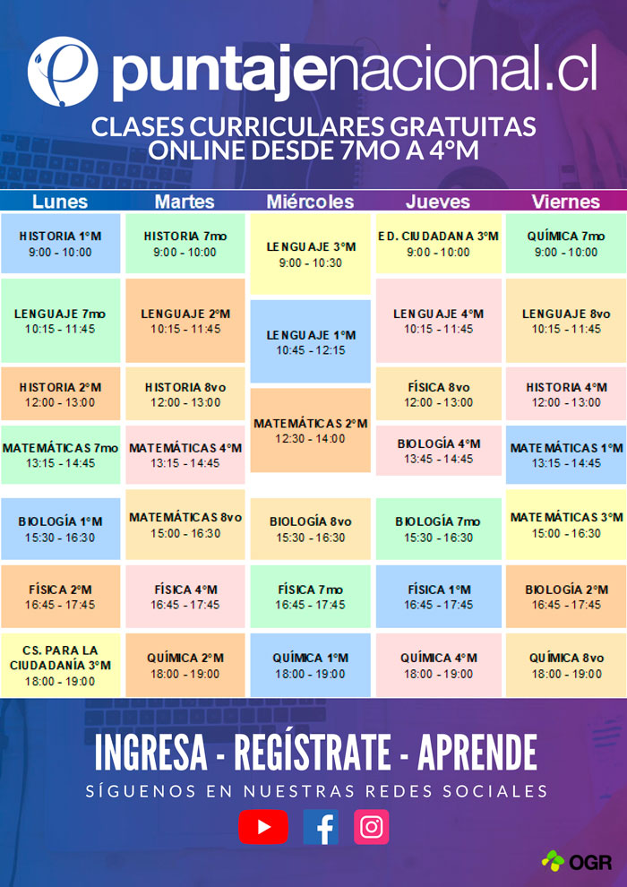 Los horarios de las clases son de lunes a viernes de 9:00 a 19:00 horas estarán dando a través de sus redes sociales como Instagram (@puntajenacional) y Youtube (@Puntajenacional chile).