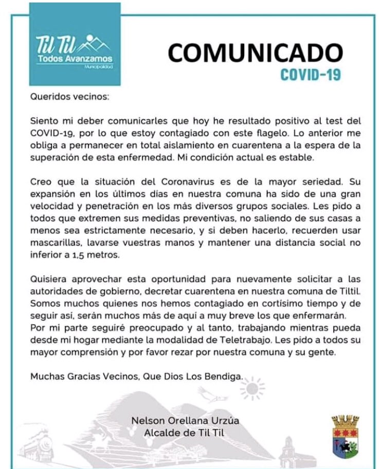 La Municipalidad de Tiltil comunicó, a través de un comunicado de presa, que su alcalde, Nelson Orellana, dio positivo para el examen de CORONAVIRUS y se trasforma en la primera autoridad comunal de la Región Metropolitana que resulta infectado con la enfermedad.