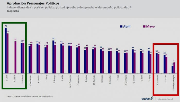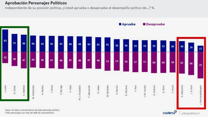 Con respecto a la clásica aprobación de Personajes Políticos, los tres primeros lugares sob liderados por alcaldes: Joaquín Lavín con 63% de aprobación, seguido por Rodolfo Carter con 51 y Evelyn Matthei con 48%. Y en el extremo de los peor evaluados, lidera la senadora UDI, J Van Rysselbergue con 75%, seguido por J. A. Kast 66% y Andrés Allamand con 62%.