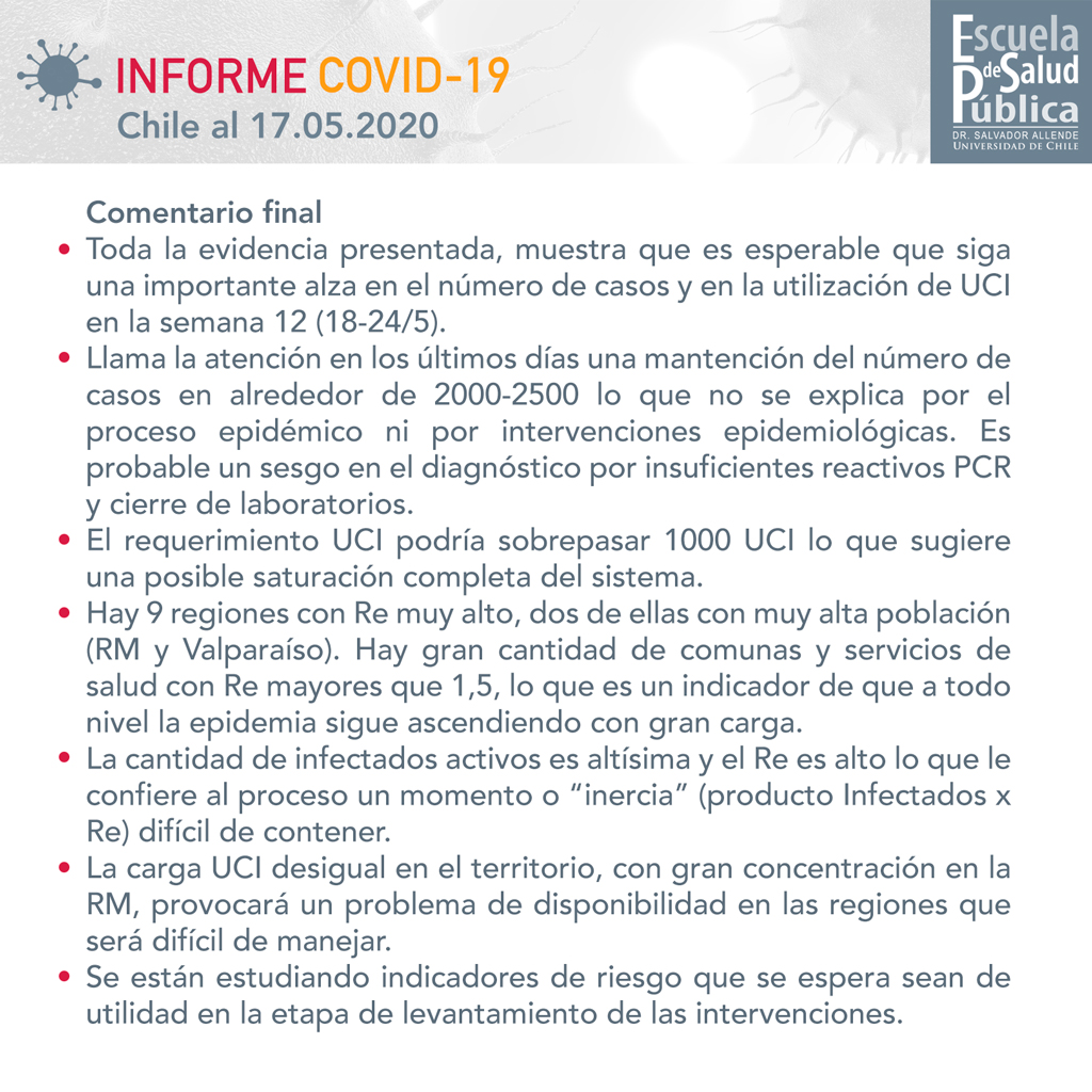 Los autores del estudio que se hace regularmente desde que partió la pandemia en el país, Mauricio Canals, Andrea Canals y Cristóbal Cuadrado, mencionan que en base a los datos y reportes epidemiológicos entregados por el Ministerio de Salud al 17 de mayo, “toda evidencia presentada, muestra que es esperable que siga una importante alza en el número de casos y en la utilización de UCI en la semana 12”.