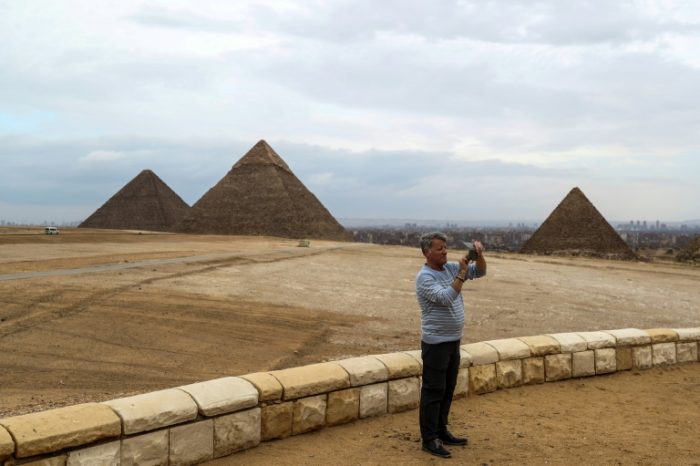 Un turista saca fotos con su teléfono móvil junto a las pirámides de Giza, el 13 de marzo de 2020 al suroeste de El Cairo. (AFP/Archivos/Mohamed el Shahed)
