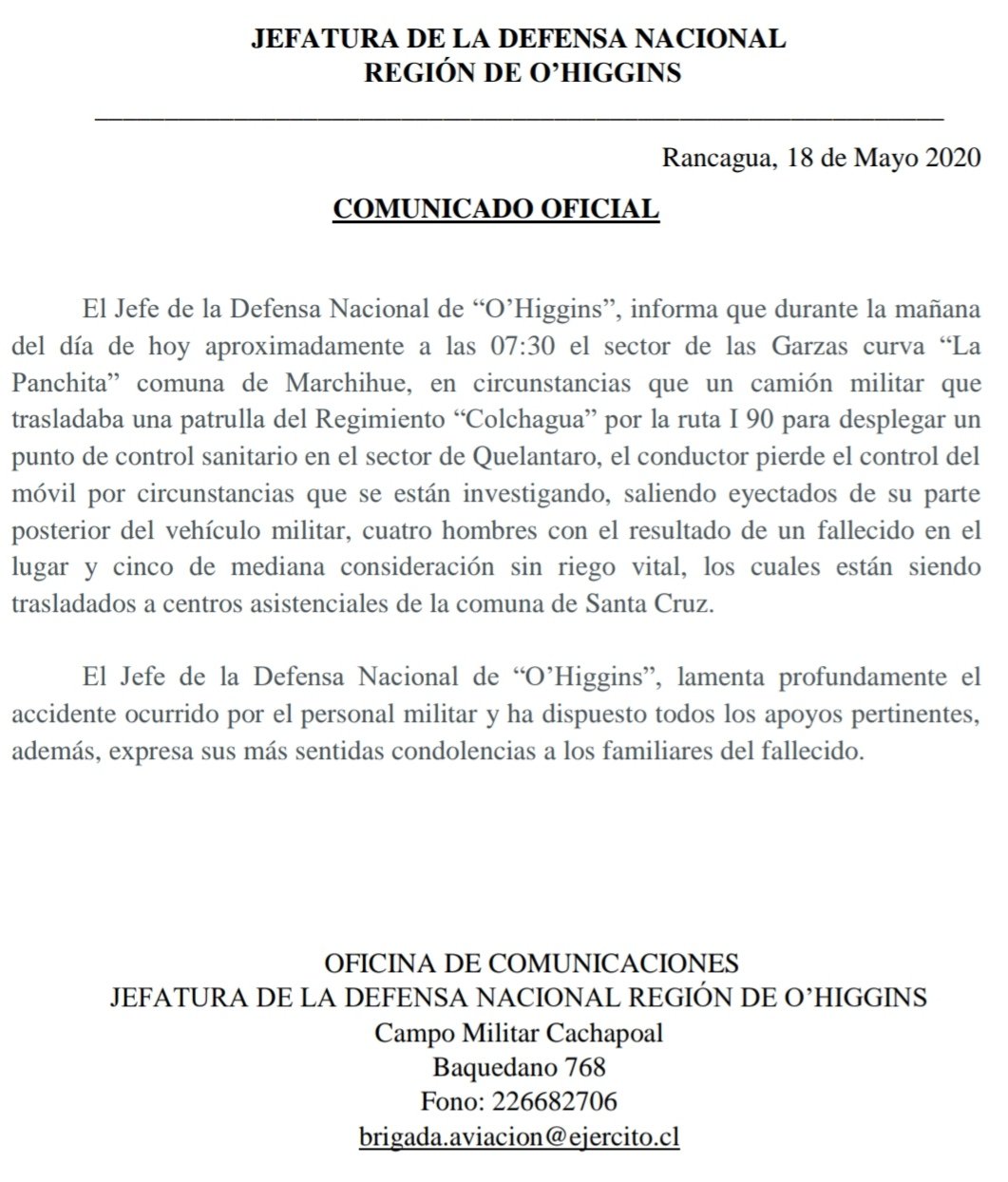 El texto semana que “aproximadamente a las 07:30 el sector de las Garzas curva “La Panchita” comuna de Marchihue, en circunstancias que un camión militar que trasladaba una patrulla del Regimiento “Colchagua” por la ruta I 90 para desplegar un punto de control sanitario en el sector de Quelentaro, el conductor pierde el control del móvil por circunstancias que se están investigando”.