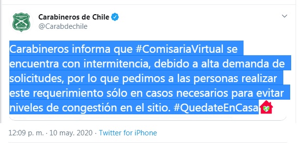 Este domingo recién a las 12:09 Carabineros informó -a través de su Twitter- «Carabineros informa que #ComisariaVirtual se encuentra con intermitencia, debido a alta demanda de solicitudes, por lo que pedimos a las personas realizar este requerimiento sólo en casos necesarios para evitar niveles de congestión en el sitio. #QuedateEnCasa».