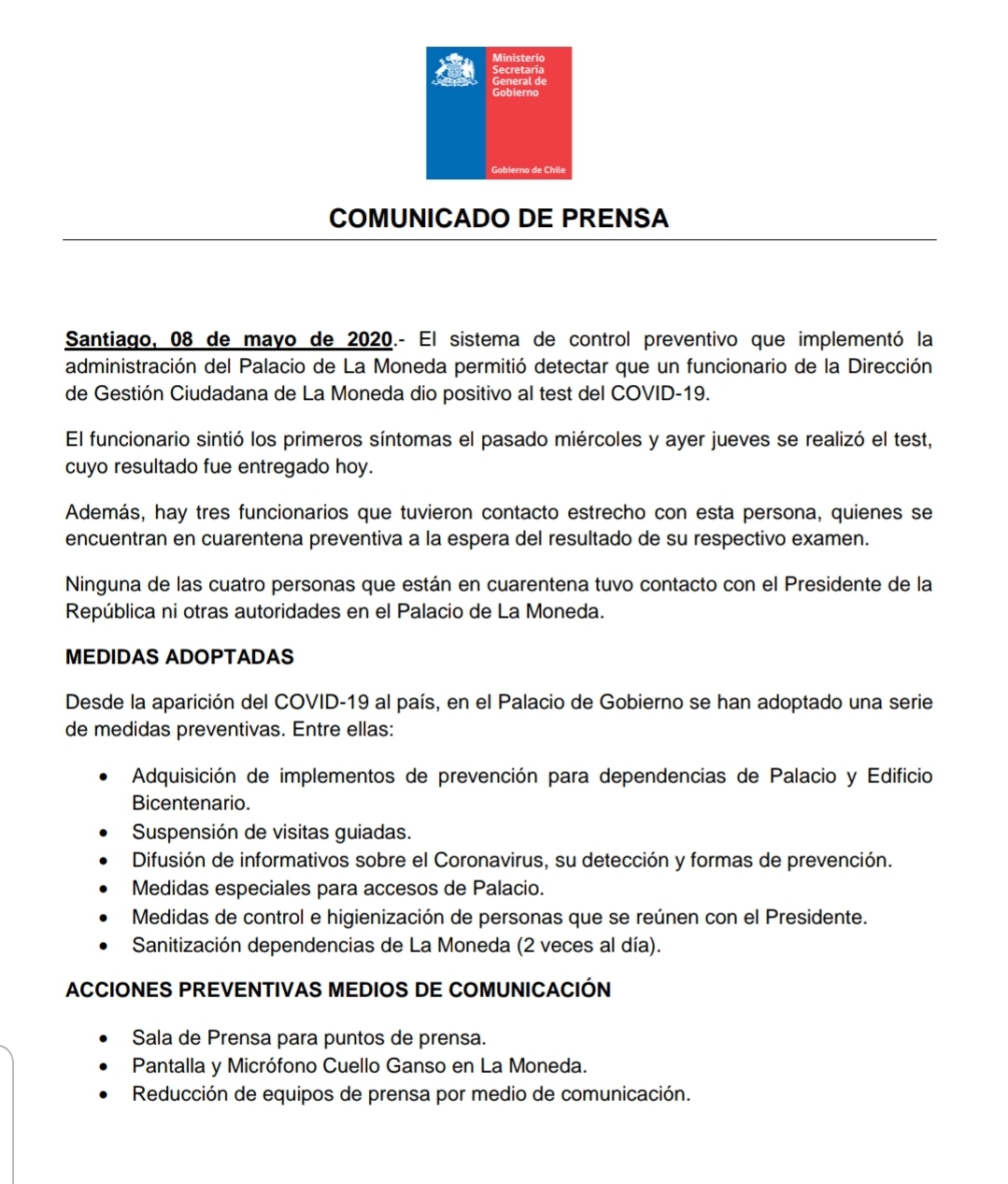 El Ministerio Secretaría General de Gobierno confirmó este viernes en la noche que un funcionario de la Dirección de Gestión Ciudadana de La Moneda dio positivo al test PCR de Covid-19.