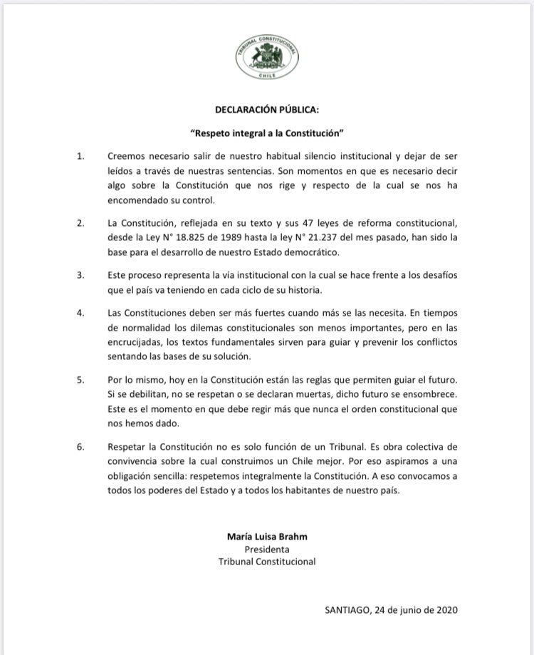 Finalmente, sostiene que es deber del TC respetar la Carta Magna y que “es obra colectiva de convivencia sobre la cual construimos un Chile Mejor. Por eso aspiramos a una obligación sencilla: respetemos integralmente la Constitución. A eso convocamos a todos los poderes del Estado y a todos los habitantes de nuestro país”.