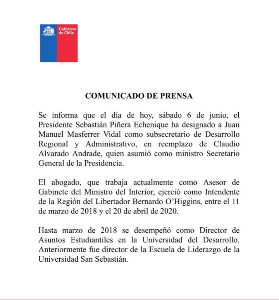 Juan Masferrer Vidal, ex intendente de la Región de O’Higgins, fue nombrado por el Gobierno como nuevo subsecretario de Desarrollo Regional, en reemplazo del recién nombrado ministro secretario general de la Presidencia, Claudio Alvarado.