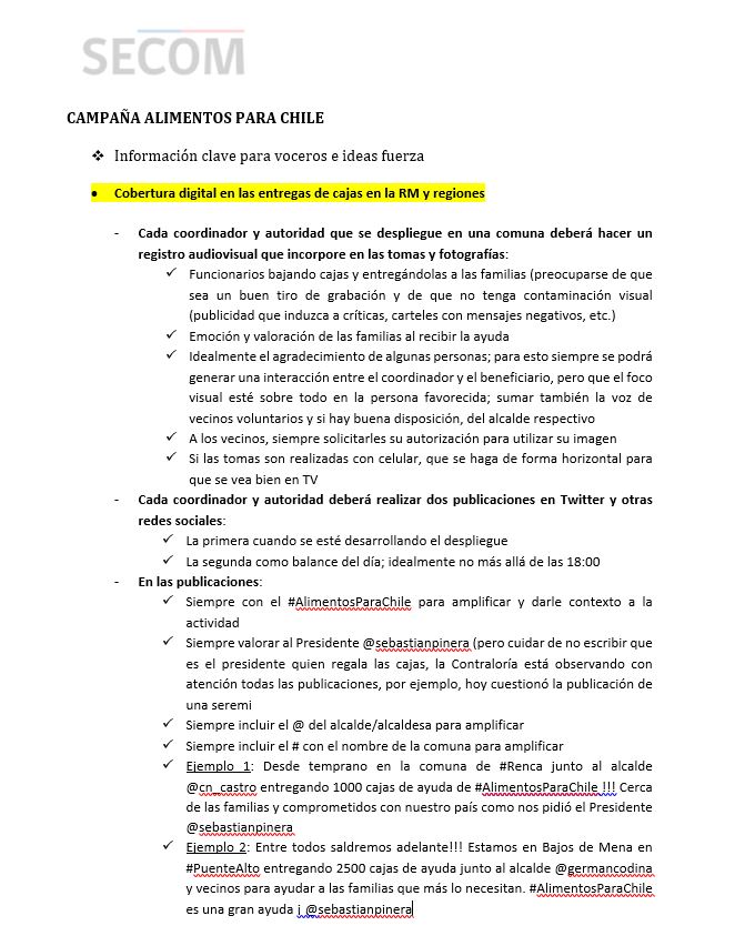 Lo más llamativo del instructivo se encuentra en el acápite “en las publicaciones” que se hacen en redes sociales, especialmente en Twitter, donde lo mas importante es “valorar al Presidente @sebastianpinera (pero cuidar de no escribir que es el presidente quien regala las cajas, la Contraloría está observando con atención todas las publicaciones, por ejemplo, hoy cuestionó la publicación de una seremi”.