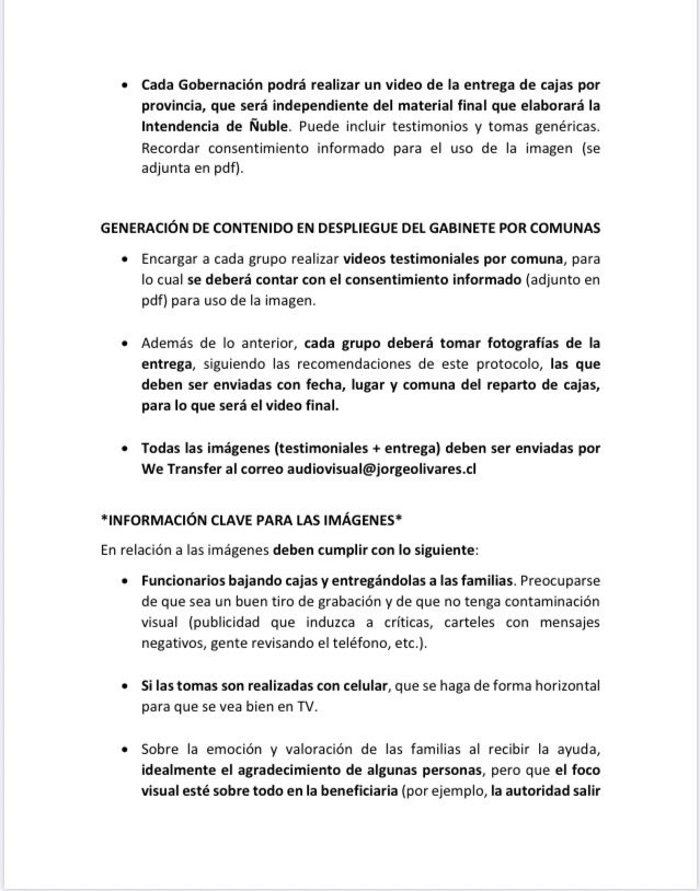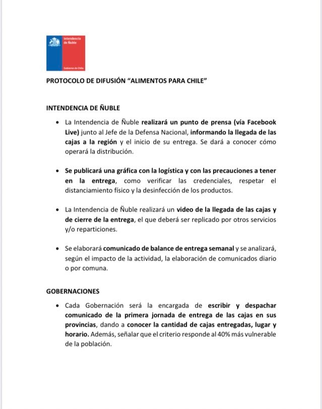 Un instructivo similar es el que entregó la Intendencia de Ñuble para la entrega de las canastas de ayuda en donde también se pide lo mismo que exige la SECOM en el documento que se filtró hoy.