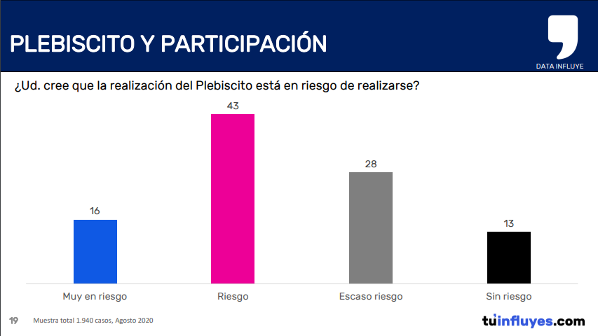 El sondeo también muestra que un 43% de los chilenos cree que está en peligro que se realice el plebiscito, un 16% señala que está en muy alto riesgo, mientras que un 28% apunta a que está en muy poco riesgo y un 13% en que no tiene ningún riesgo.