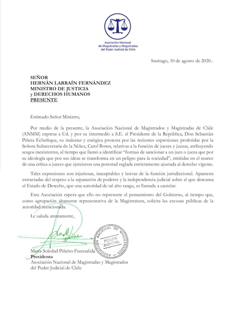 “Expresa a Ud. y por su intermedio a S.E. el Presidente de la República, Don Sebastián Piñera Echeñique, su malestar y enérgica protesta por las recientes expresiones proferidas por la Señora Subsecretaria de la Niñez, Carol Bown, relativas a la función de jueces y juezas, atribuyendo sesgos inexistentes, al tiempo que llamó a identificar “formas de sancionar a un juez o jueza que por su ideología que por sus ideas se transforma en un peligro para la sociedad”, emitidas en el marco de una crítica a jueces que ejercieron una potestad reglada estrictamente ajustada al derecho vigente”, exponen los magistrados.