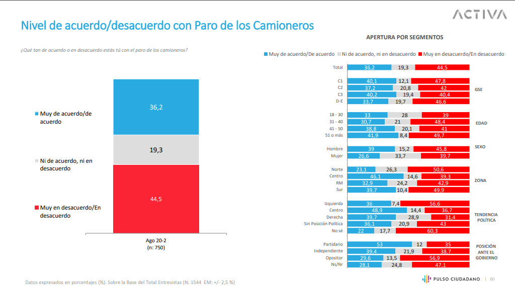 Es así como el 44,5% dice está en desacuerdo con la movilización realizada por los transportistas, mientras que un 36,2 se inclina por apoyar a los camioneros.