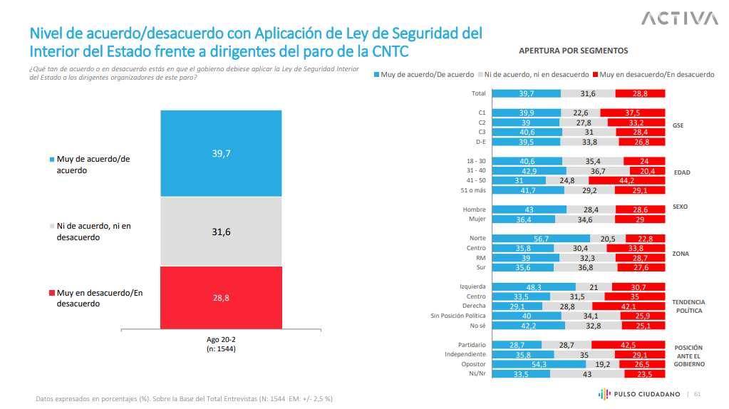Asimismo, el estudio revela que un 39,7% de los entrevistados está a favor que el Gobierno aplique la Ley de Seguridad Interior del Estado a los dirigentes que organizaron el paro, mientras que un 28,8% opta porque las autoridades no invoquen la mencionada normativa en contra de los organizadores de la movilización.