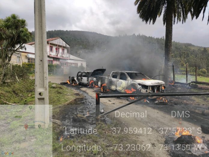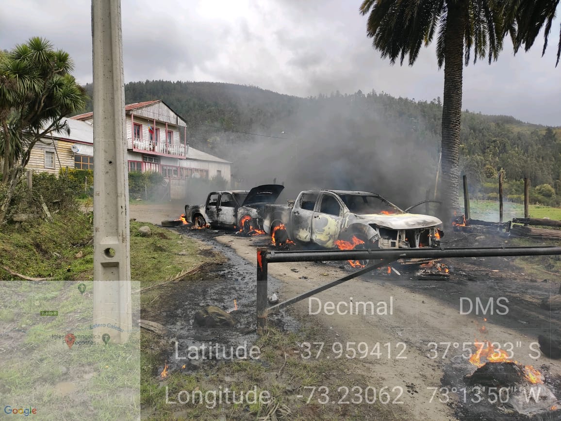 Desconocidos quemaron dos camionetas de Carabineros, en medio de un incidente en una faena forestal en la comuna de Contulmo, Región del Bío Bío.