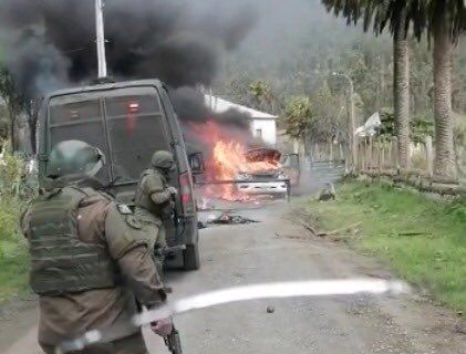 CONTULMO | Dos camionetas del OS 9 de Carabineros que efectuaban una investigación fueron quemadas en el sector de Elicura. El personal policial atacado pidió ayuda y hasta ahora continúan los ataques armados en la zona. pic.twitter.com/AUax4pzxcI