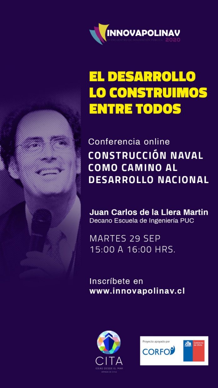 Con la exposición online «Construcción naval como camino al desarrollo nacional«, a cargo del decano de la Escuela de Ingeniería de la Pontificia Universidad Católica de Chile, Juan Carlos de la Llera, prosigue desarrollándose la serie de conferencias internacionales enmarcadas en el Tercer Encuentro de Innovación Pública, Innovapolinav 2020.