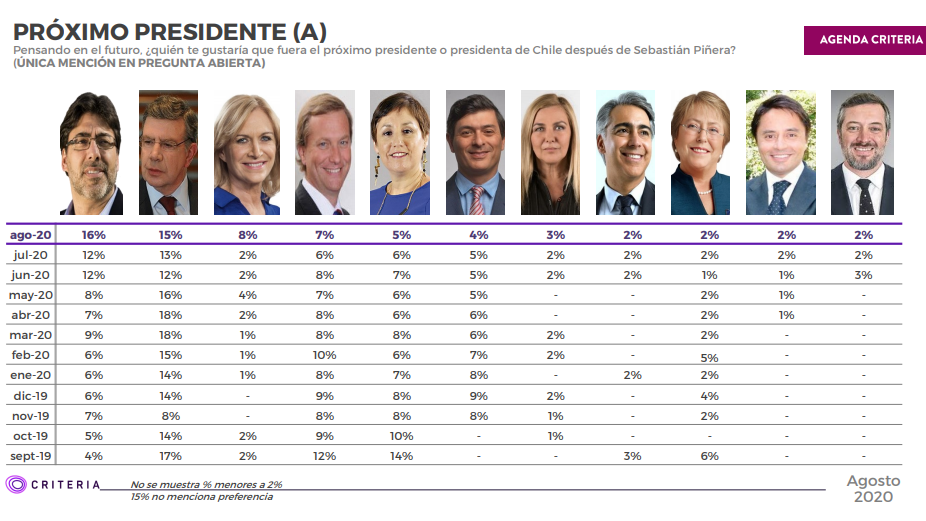 Los datos entregados por Criteria también demuestran la preferencia de la ciudadanía a los alcaldes, puesto que los tres primeros lugares aparecen ediles de distintas comunas, lo cual muestra que durante la pandemia las autoridades comunales están mejor evaluadas que los personajes de los partidos políticos y de Gobierno por las gestiones a favor de sus comunidades en esta crisis sanitaria y económica.