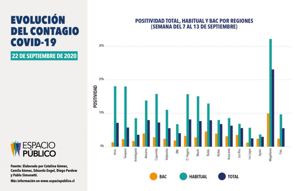 El índice de positividad, definido como la fracción de tests PCR que resulta positiva en un territorio y periodo determinado, agrupa información proveniente de dos estrategias muy distintas. La primera considera la manera habitual de realizar tests, centrada en personas que se acercan a un centro médico porque tienen síntomas. La segunda, correspondiente a la BAC, consiste en una estrategia desarrollada desde agosto para salir a buscar personas que podrían estar contagiadas.